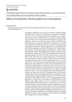 Although the Mallard is one of the most numerous and best-studied waterbirds in the world, it received almost no attention in Slovenia. It is one of the most frequently observed waterbirds in our country, with frequency often reaching 100%. Sites with lower frequency either freeze in winter or have a low number of individuals to start with. The Mallard is also the most dominant species (17.5% and 89.0%) with higher dominance at sites less suitable for waterbirds due to the lack of available shoals. Mallards reach their maximum numbers during fall migration and winter. Spring migration has no discernible peak and has been significant only for Lake Cerknica. On shallow waters, the maximum is reached in August and September, a month before fall migration begins, indicating local movement to food-rich sites. Females make up only 36.7% of the observed Mallards and reach the maximum proportion (41.5%) in winter and the lowest in April and May (14.7%), when they nest. The breeding season in Slovenia lasts from mid-January to early December, with the majority of females rearing broods from April to July. Average brood size is 6.2 ± 2.66 and declines with season, age of young and altitude. It varies between habitat types and is highest on Treatment and Coastal Wetlands (7.3) and lowest on deep waters such as Reservoirs (5.7) and Lakes (5.6). No really high breeding densities were found in Slovenia and were similar to those in other countries. Breeding densities are higher on smaller Ponds (< 8 ha), on sites with isolated islands and breeding colonies of gulls and terns (e.g. Lake Ptuj). Breeding density also decreases with elevation. Slovenian breeding population is estimated at 1,473–3,763 bp and wintering population averages 22,237 (10,376–32,010) individuals. Data suggest a decline in the wintering population most likely due to warmer winters. The majority of Mallards winter in NE Slovenia, where eight of eleven sites have a maximum of more than 1,000 Mallards. Most Mallards winter on the Drava river with Ptuj and Ormož lakes, where the highest numbers of Mallards were also recorded (Lake Ptuj: 8,330 ind., Lake Ormož: 5,400 ind.). The highest number of individuals during spring migration was recorded on Lake Cerknica (4,581) and during autumn migration on Medvedce reservoir (3,379). Apart from standing waters, the highest density of wintering Mallards is found in urban sections of slow-flowing rivers, probably due to higher safety and food availability. 72,731 Mallards were hunted between 2001 and 2018, mainly in NE Slovenia (28% in the Pomursko hunting management district). The number of Mallards hunted is declining in all hunting areas and has declined by 64% since 2001 and even more since the 1990s. According to hunt data, hunting is by far the most important cause of the Mallard mortality in Slovenia (97.4%), followed by predation (1.1%). The Mallard mortality in Slovenia is largely unstudied and natural mortality is most likely underestimated, not only because it does not include mortality in the pre-fledging period, a period with the lowest survival, but also because the detectability of natural mortality is considerably lower. In contrast to the hunted numbers, there have been only nine recoveries of ringed individuals from abroad in the last 100 years, suggesting that hunters may not be reporting recoveries to the ringing centre. Apart from the 1972–1975 period, when 87% of Mallards were ringed, the intensity of ringing of Mallards in Slovenia is low, resulting in only seven Mallards recovered abroad. The longest distance of a Mallard ringed in Slovenia comes from Ukraine (1,290 km), while the longest distance between ringing and recovery sites is 2,075 km from an individual ringed in Finland. The only colour morphs documented in Slovenia are Mallards with paler feathers, attributed to one of the colour aberrations resulting from lower melanin productivity. Only few hybrids and mixed pairings with other wild duck species were observed.