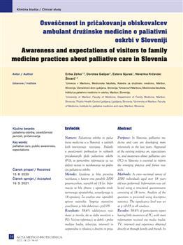 Zelko, Erika, Gašpar, Dorotea, Gjuras, Estera, Krčevski-Škvarč, Nevenka (2021). Awareness and expectations of visitors to family medicine practices about palliative care in Slovenia.