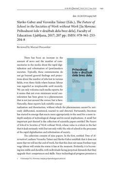 Poljanšek, Matjaž (2018). Slavko Gaber and Veronika Tašner (Eds.), The future of school in the societies of work without work in Slovene: Prihodnost šole v družbah dela brez dela, Faculty of Education: Ljubljana, 2017; 207 pp.: ISBN: 978-961-253-204-8.