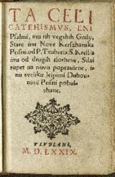 Dalmatin, Jurij, Trubar, Primož, Krelj, Sebastijan, Mandelc, Janez (1579). Ta celi catehismus, eni psalmi, inu tih vegshih gody, stare inu nove kerszhanske peisni, od P. Truberia, S. Krellia inu od drugih sloshene, sdai supet na novu popraulene, inu sveliku leipimi duhounimi peisni pobulshane. URN:NBN:SI:DOC-UGF0YBAD from http://www.dlib.si