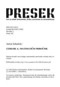 Suhadolc, Anton (1996). Cedilnik A.: Matematični priročnik, Didakta, Radovljica 1995, 462 str..