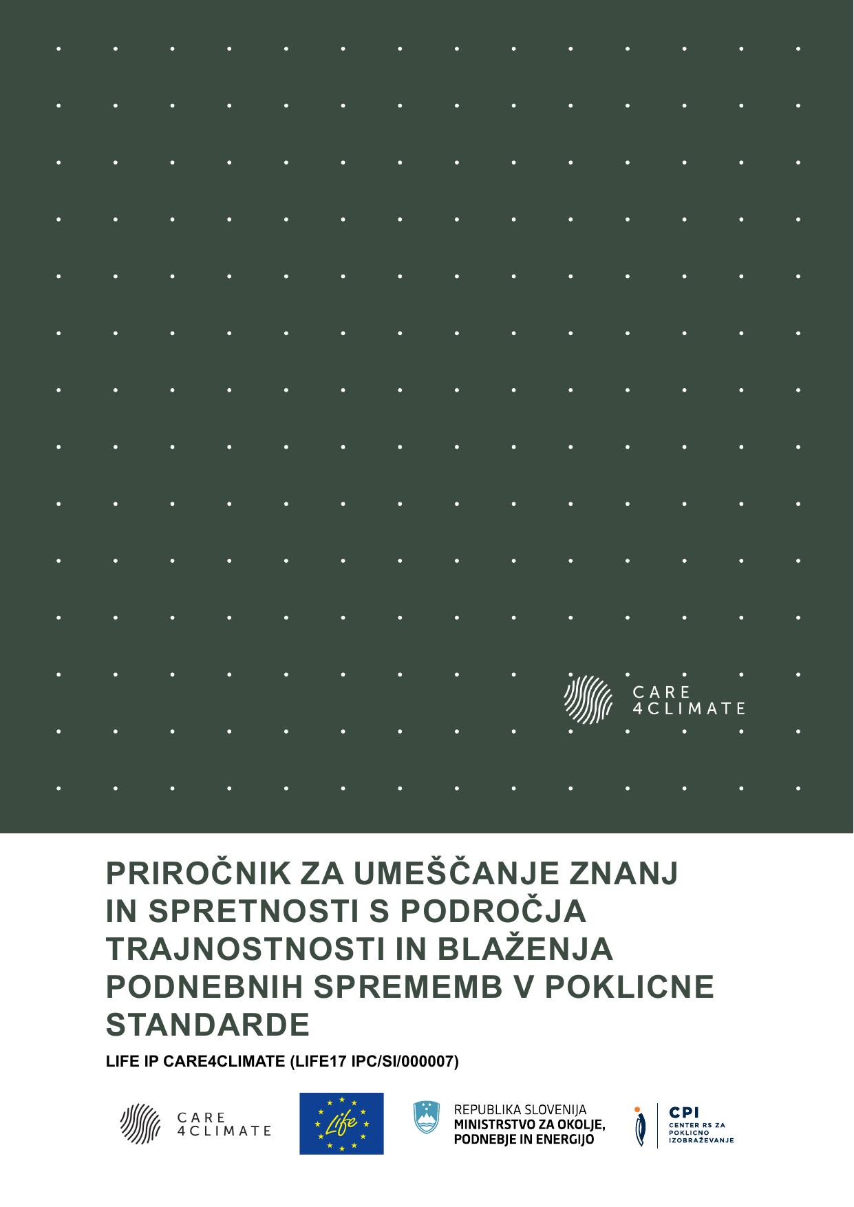 Priročnik za umeščanje znanj in spretnosti s področja trajnostnosti in blaženjapodnebnih sprememb v poklicne standarde.