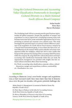 Stander, Stefan, Buys, Pieter, Oberholzer, Merwe. "Using the cultural dimension and accounting value classification frameworks to investigate cultural diversity in a multi-national South African-based company."