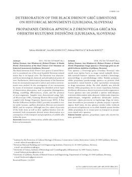 Kramar, Sabina, Mladenovič, Ana, Pristacz, Helmut, Mirtič, Breda (2011). Deterioration of the black Drenov grič limestone on historical monuments (Ljubljana, Slovenia).