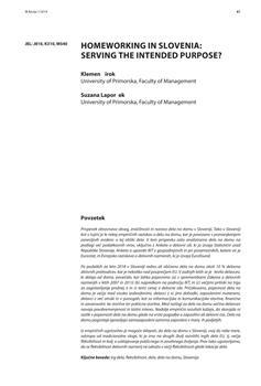 Prispevek obravnava obseg, značilnosti in naravo dela na domu v Sloveniji. Tako v Sloveniji kot v tujini je le nekaj empiričnih raziskav o delu na domu, kar je povezano s pomanjkanjem zanesljivih evidenc o tej obliki dela. V tem prispevku zato analiziramo delo na domu na podlagi več podatkovnih virov, vključno z Anketo o delovni sili, ki jo izvaja Statistični urad Republike Slovenije, Anketo o uporabi IKT v gospodinjstvih in pri posameznikih, katere vir je Eurostat, in Evropsko raziskavo o delovnih razmerah, ki jo izvaja Eurofound. Po podatkih za leto 2018 v Sloveniji redno ali občasno dela na domu okoli 10 % delovno aktivnih prebivalcev, kar je nekoliko nad povprečjem EU. V zadnjih letih se je število delavcev, ki delajo od doma, povečalo, kar lahko pojasnimo (a) s spremembami Zakona o delovnih razmerjih v letih 2007 in 2013; (b) napredkom na področju IKT; in (c) večjimi pritiski na trgu za zagotavljanje prožnejše in (s tem) cenejše delovne sile. Pričakovano, pojavnost dela na domu je večja med visoko izobraženimi, delavci z višjimi dohodki, zaposlenimi materami, delavci z več otroki in v panogah, kot so informacijske in komunikacijske storitve, finančne in zavarovalniške storitve ter poklicne storitve. Med razlogi za delo na domu večina delavcev navaja preobremenjenost in lastni interes. Nadalje empirični rezultati kažejo, da skorajda ni razlik v pojavnosti dela na domu glede na vrsto pogodbe o zaposlitvi ali delovni čas. Delo na domu pogosteje opravljajo samozaposleni oziroma zaposleni v manjših podjetjih. Iz empiričnih ugotovitev je mogoče sklepati, da delo na domu v Sloveniji, vsaj do neke mere, odstopa od tradicionalne vloge, ki jo ima na drugih (bolj razvitih) trgih dela EU, tj. večja fleksibilnost in boljše usklajevanje poklicnega in zasebnega življenja. Prav tako ugotavljamo, da se fleksibilnost delovnih razmerij ne odraža v večji fleksibilnosti glede lokacije dela.