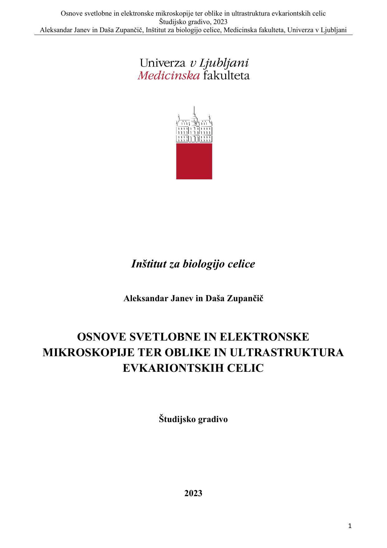 Študijsko gradivo Osnove svetlobne in elektronske mikroskopije ter oblike in ultrastruktura evkariontskih celic, 2023 je namenjeno študentom Laboratorijske biomedicine, Fakultete za farmacijo, Univerze v Ljubljani, ki opravljajo del vaj pri predmetu Biologija celice z genetiko na Inštitutu za biologijo celice Medicinske fakultete, Univerze v Ljubljani. Prvi del (poglavja 1.1 do 2.3) predstavlja osnovno gradivo, ki omogoča študentu pripravo na vaje. Sheme so pripravljene s spletnim orodjem BioRender. Vse slike in mikrografije so last Inštituta za biologijo celice Medicinske fakultete Univerze v Ljubljani. Drugi del (navodila za vaje), vsebuje navodila in naloge, ki jih mora študent na vajah opraviti. Ta del si mora vsak študent natisniti in prinesti na vaje. Pravilno izpolnjene, pregledane in podpisane naloge so dokazilo o aktivnem sodelovanju na vajah. Znanje potrebno za pozitivno opravljanje kolokvija bodo študentje pridobili na vajah.
