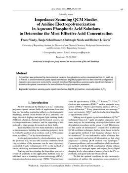 Wudy, Franz, Schedlbauer, Tanja, Stock, Christoph, Gores, Heiner J.. "Impedance scanning QCM studies of aniline electropolymerization in aqueous phosphoric acid solutions to determine the most effective acid concentration."