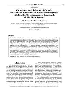 Mohammad, Ali, Khatoon, Shumaila. "Chromatographic behavior of cationic and nonionic surfactants on silica gel impregnated with paraffin oil using aqueous formamide mobile phase systems."