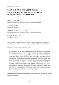 Ulčar, Matej, Supej, Anka, Robnik Šikonja, Marko, Pollak, Senja. "Slovene and Croatian word embeddings in terms of gender occupational analogies."