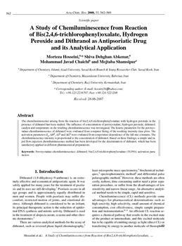 Hosseini, Morteza, Abkenar, Shiva Dehghan, Chaichi, Mohamed Javad, Shamsipur, Mojtaba. "A study of chemiluminescence from reaction of bis (2,4,6-trichlorophenyl) oxalate, hydrogen peroxide and dithranol as antipsoriatic drug and its analytical application."