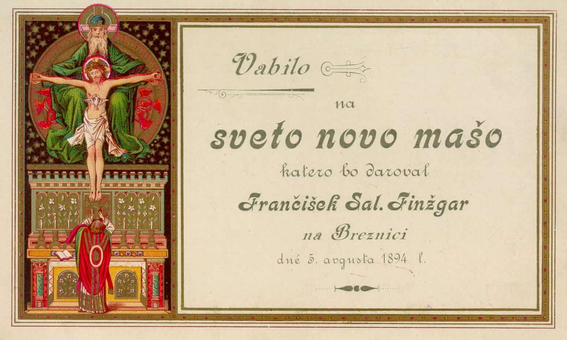 Vabilo na sveto novo mašo: katero bo daroval Frančišek Sal. Finžga (1894). URN:NBN:SI:IMG-7F5W4SVB from http://www.dlib.si