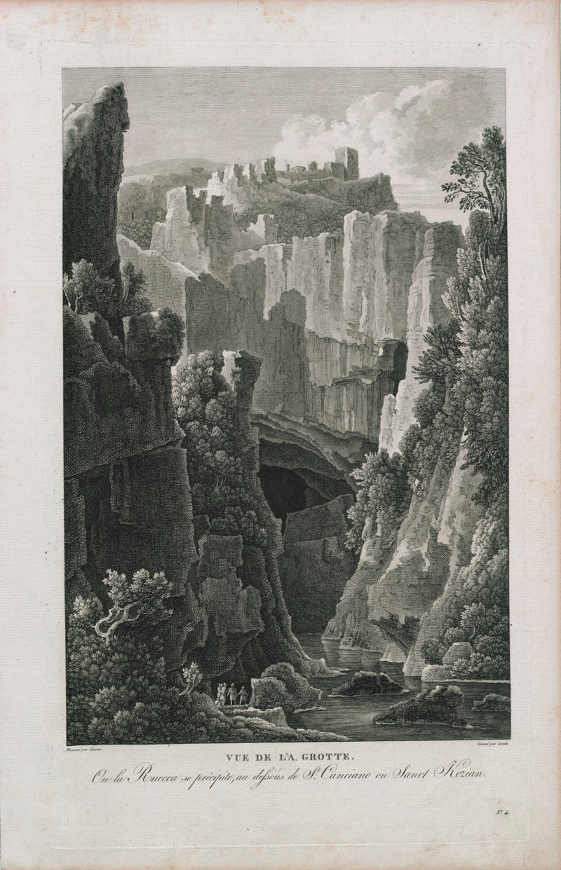 Vue de la grotte : ou la Ruecca se précipite, au defsous de St. Canciano ou Sanct Kozian
