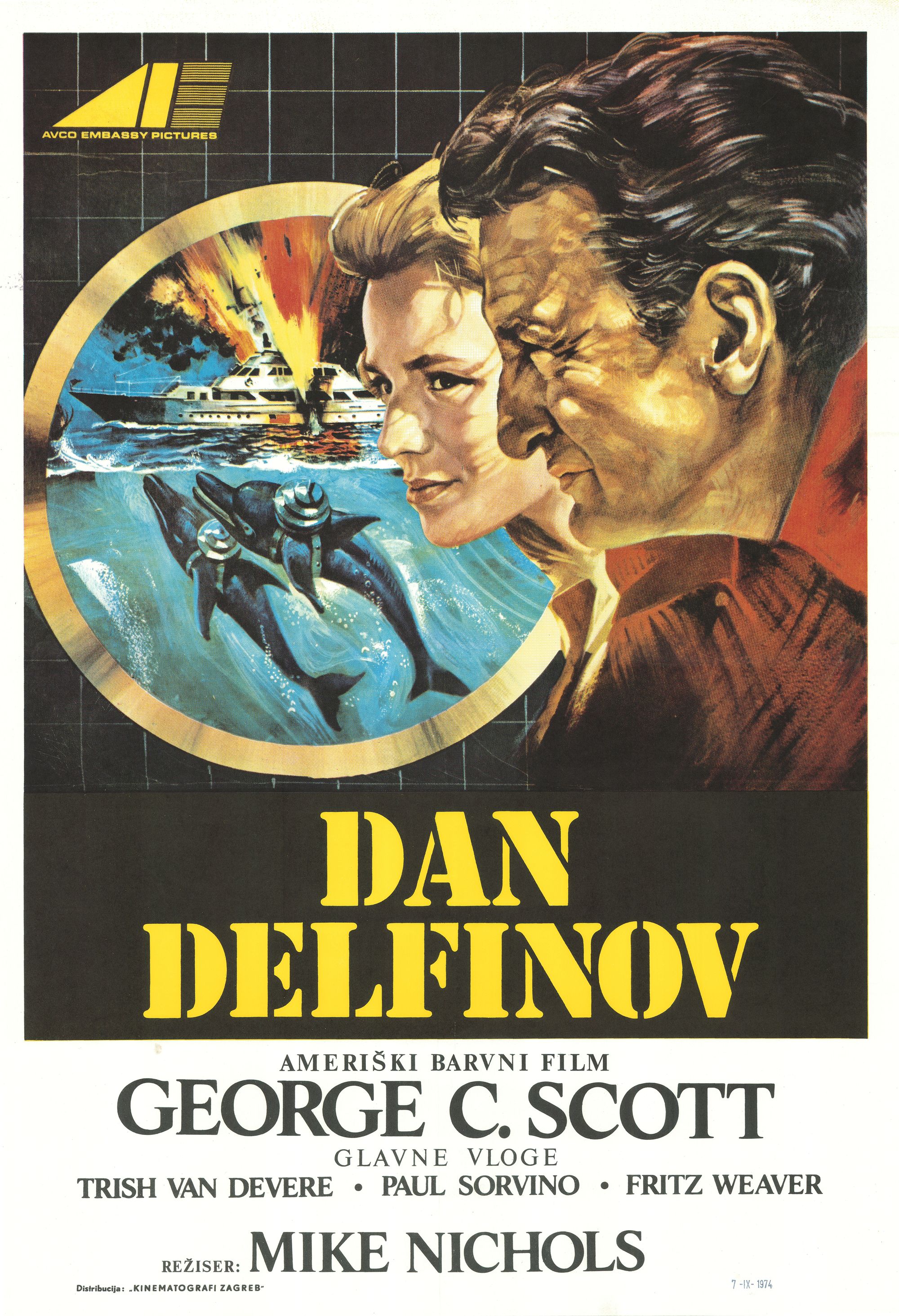 Dan delfinov : ameriški barvni film : George C. Scott : glavne vloge Trish Van Devere, Paul Sorvino, Fritz Weaver : režiser Mike Nichols