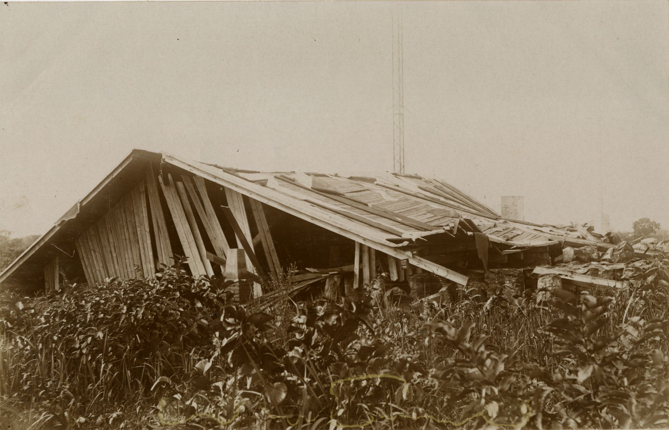Codelli, Anton. Poškodbe na eni od stavb radiotelegrafskega kompleksa v Kamini. 1914.