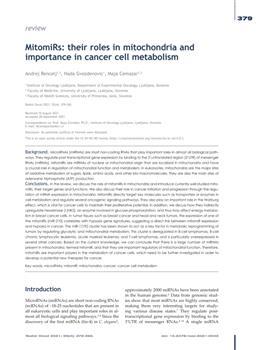Renčelj, Andrej, Gvozdenović, Nada, Čemažar, Maja. "MitomiRs: their roles in mitochondria and importance in cancer cell metabolism."