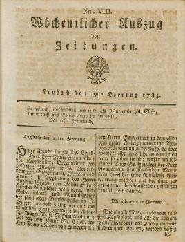 Wöchentlicher Auszug von Zeitungen je tedensko izhajal v Ljubljani, na pomajšanem A5-formatu. Posamezna številka je bila natisnjena na štirih straneh, torej dveh listih. Prinašal je novice in poročila iz prestolnic ter drugih krajev doma in na tujem, na zadji strani pa je vseboval podatke bolj lokalnega značaja. Po letu izhajanja se preimenuje v Laibacher Zeitung.