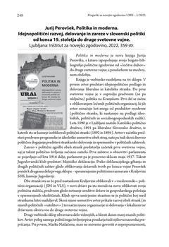Jurij Perovšek: Politika in moderna. Idejnopolitični razvoj, delovanje in zareze v slovenski politiki od konca 19. stoletja do druge svetovne vojne Ljubljana: Inštitut za novejšo zgodovino, 2022, 359 str. (številka: 3, 2023)