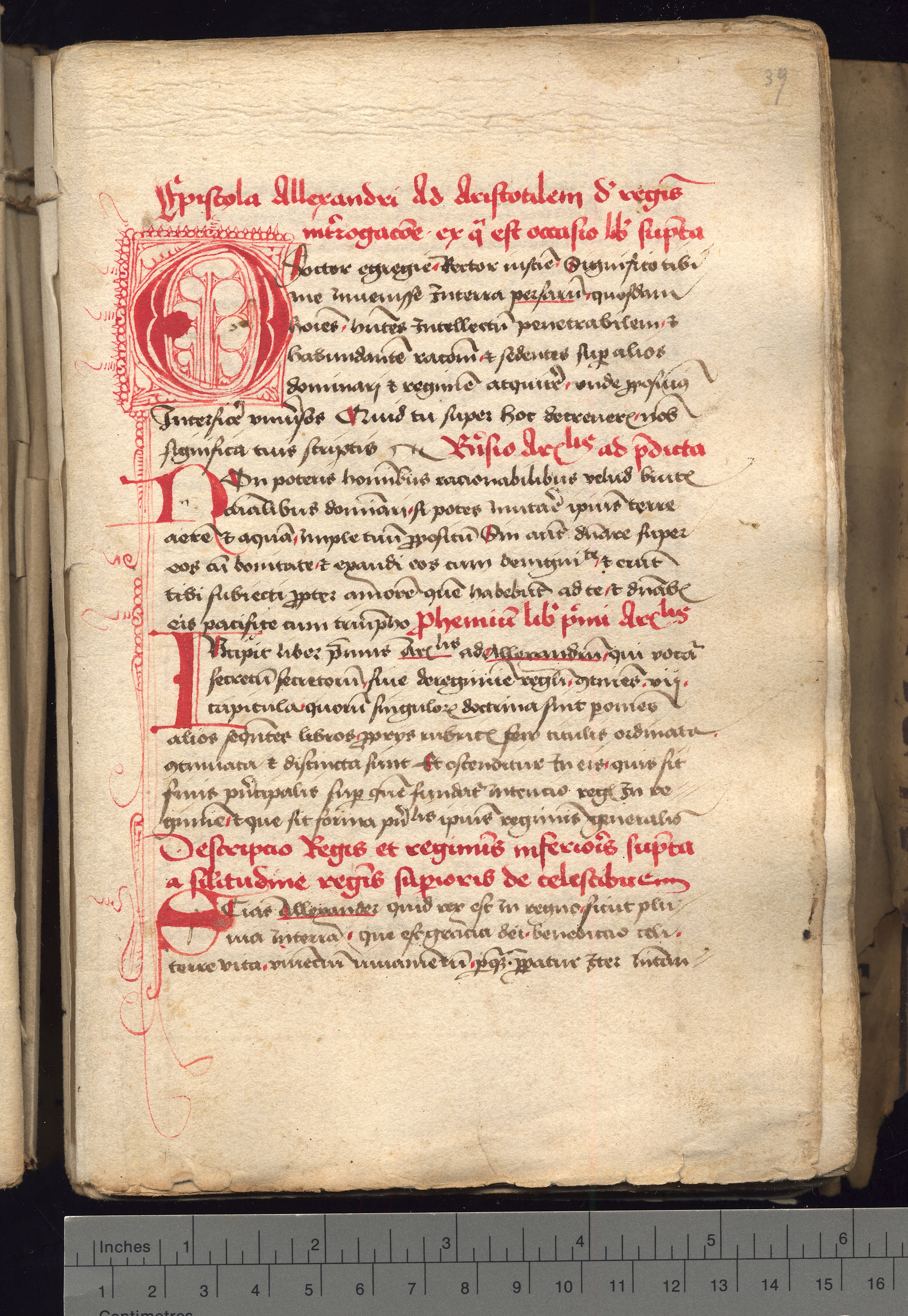 Epistola Alexandri ad Aristotilem de regiminis interrogacione - barvne iniciale
