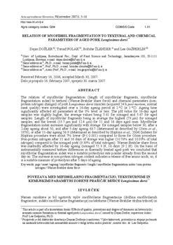 Namen raziskave je bil ugotoviti vpliv miofibrilarne fragmentacije (dolžina miofibrilarnih fragmentov, indeks miofibrilarne fragmentacije) na teksturne (Warner-Bratzler strižna trdnost) in kemijske parametre (neproteinski dušik) mišice Longissimus dorsi (LD) prašiča. V poskus so bile 24 ur post mortem vključene leve in desne LD normalne kakovosti šestih prašičev. Mišice smo razdelili na 3 dele, jih vakuumsko embalirali in zoreli 1-, 2-, 3-, 5-, 11- in 16 dni pri temperaturi 2 °C ( 1 °C). Čas zorenja je značilno (P . 0,001) vplival na vse parametre. Vrednost pH se je v 16-ih dneh nekoliko povečala, in sicer je bila povprečno: pri nezorenih mišicah 5,61 in pri zorenih 5,67. Dolžina miofibrilarnih fragmentov je bila v povprečju največja (73 m) pri nezorenih vzorcih, medtem ko je bila pri 11- in 16 dni zorenih vzorcih značilno manjša (15,7 m in 12,4 m). Indeks miofibrilarne fragmentacije se z zorenjem značilno poveča, in sicer je v povprečju: pri nezorenih vzorcih pod 30, pri 2 dni zorenih pod 50 in pri 5 dni zorenih 63,7 (določen po Olsonu in sod., 1976) oziroma pri 11 dni zorenih 56,9 (določen po Hopkinsu s sod.). Indeks določen po Hopkinsu (2004) je okrog 7 % (P . 0,001) nižji glede na indeks določen po Olsonu. Neproteinski dušik je pri 11- in 16 dni zorenih vzorcih večji (10,78 % in 10,93 %) od nezorenih vzorcev (9,39 % od celokupnega dušika). Warner-Bratzler strižna trdnost se v 16-ih dnevih zorenja značilno (P . 0,001) spremeni. Povprečna vrednost nezorenih vzorcev je 51,3 N in pri 16 dni zorenih vzorcih 29,2 N. Na osnovi instrumentalno izmerjene teksture termično obdelanih vzorcev lahko zaključimo, da je indeks miofibrilarne fragmentacije e po drugem dnevu zorenja ustrezni pokazatelj mikrostrukturnih proteolitičnih sprememb, in da je vsebnost neproteinskega dušika ustreyni pokayatelj biokemičnih proteolitičnih sprememb šele po petem dnevu zorenja, ker so povečane vrednosti neproteinskega dušika posledica sproščanja prostih aminokislin.
