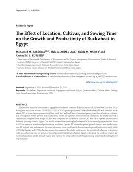 Hassona, Mohamed M., Abd El-Aal, Hala A., Morsy, Nahla M., Hussein, Ahmed M. S. (2024). The effect of location, cultivar, and sowing time on the growth and productivity of buckwheat in Egypt.