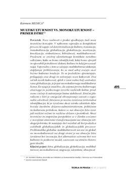 Nove realnosti v praksi spodbujajo tudi nove teoretične koncepte. V njihovem ospredju so kompleksni procesi, ki segajo od deteritorializacije kulture, translacije, transkulturacije, globalizacije, glokalizacije, mestizacije, kreolizacije, sinkretizmov, hibridnosti, multikulturnosti. Predvsem se znotraj identitetnega konteksta nenehno odločamo, kako se bomo identificirali, kdaj bomo sprejeli in uporabili potrditveni diskurz kulture in kdaj procesualnega. Vzporedno s tem se odvijajo multikulturna stekanja, stapljanja, približevanja, ko se med seboj srečajo sicer ločene kulturne tradicije. Te se posledično spreminjajo, prilagajajo ena drugi in ustvarjajo nove kakovosti. Ena od teh novih kakovosti, sploh v času vedno bolj centralizirane globalizacije, je pojav monokulturnega multikulturalizma. Za njega je značilno, da zajema prvine kulturnega, etničnega in jezikovnega izročila različnih kultur, predvsem s težnjo k ustvarjanju lastne stabilnosti. Etnični pluralizem v Istri je omogočal ohranjevanje zavesti o regionalni celovitosti. Istočasno je močno izražena teritorialna identifikacija, ki je izražena skozi istrsko identiteto kljubovala številnim državno-administrativnim, političnim in kulturnim pritiskom, katere so na območju Istre izvajali različni režimi in različne države v preteklosti. Skozi teoretične in empirične perspektive se v članku soočamo z novejšimi etničnimi transformacijami na območju istrskega polotoka, ki nastajajo kot rezultat ali kot posledica sodobnih globalizacijskih in glokalizacijskih procesov. Problematika globalne multikulturnosti na eni in glokalne monokulturnosti na drugi strani je na območju Istre izražena kot inovacija, kot alternativa oziroma kot nov kulturni in jezikovni model, zasnovan na etnično heterogeni družbi.