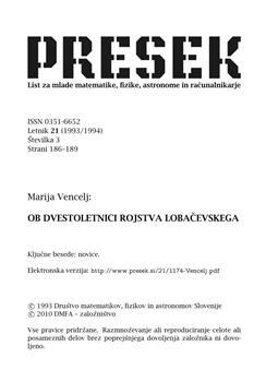 Vencelj, Marija (1993). Ob dvestoletnici rojstva Lobačevskega.