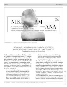 Ravnik, Mojca (2018). Nekaj misli o Nikrmani, folklornem koncertu Akademske folklorne skupine France Marolt.