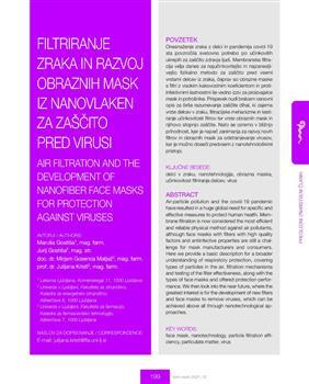 Gostiša, Maruša, Gostiša, Jurij, Gosenca Matjaž, Mirjam, Kristl, Julijana. "Filtriranje zraka in razvoj obraznih mask iz nanovlaken za zaščito pred virusi."