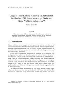 Limbek, Marko. "Usage of multivariate analysis in authorship attribution: did Janez Mencinger write the story "Poštena Bohinčeka"?."